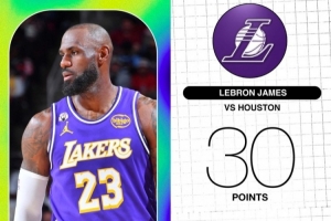 本场比赛,湖人球星詹姆斯上场34分钟,14投13中得到30分5篮板2助攻1抢断1盖帽。詹姆斯本场的投篮命中率高达92.9%,追平生涯最高纪录。