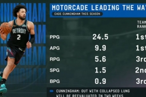 活塞官方:坎宁安患有左侧肺气胸 将在两周后重新接受复查