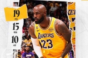 赛后湖人官方发布詹姆斯本场数据海报,本场比赛詹姆斯背靠背出战并砍下三双。