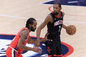 本赛季至今伦纳德出战了48场比赛,场均出战32.4分钟,得到27.9分6.4板3.7助2断,投篮命中率49.7%;KD出战了59场比赛,场均36.7分钟,得到26.1分5.5板4.5助0.9断,投篮命中率50.9%。