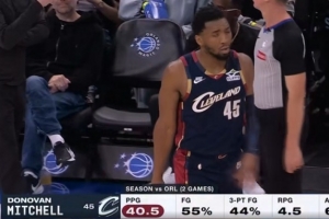本赛季面对魔术(2场),米切尔场均40.5分4.5篮板6.5助攻,投篮命中率55%,三分命中率44%