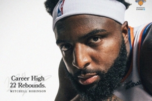 此役尼克斯中锋米切尔·罗宾逊表现抢眼,出场30分钟10投6中,拿到12分抢下22个篮板(9个前场),外加2抢断2盖帽,正负值+20。